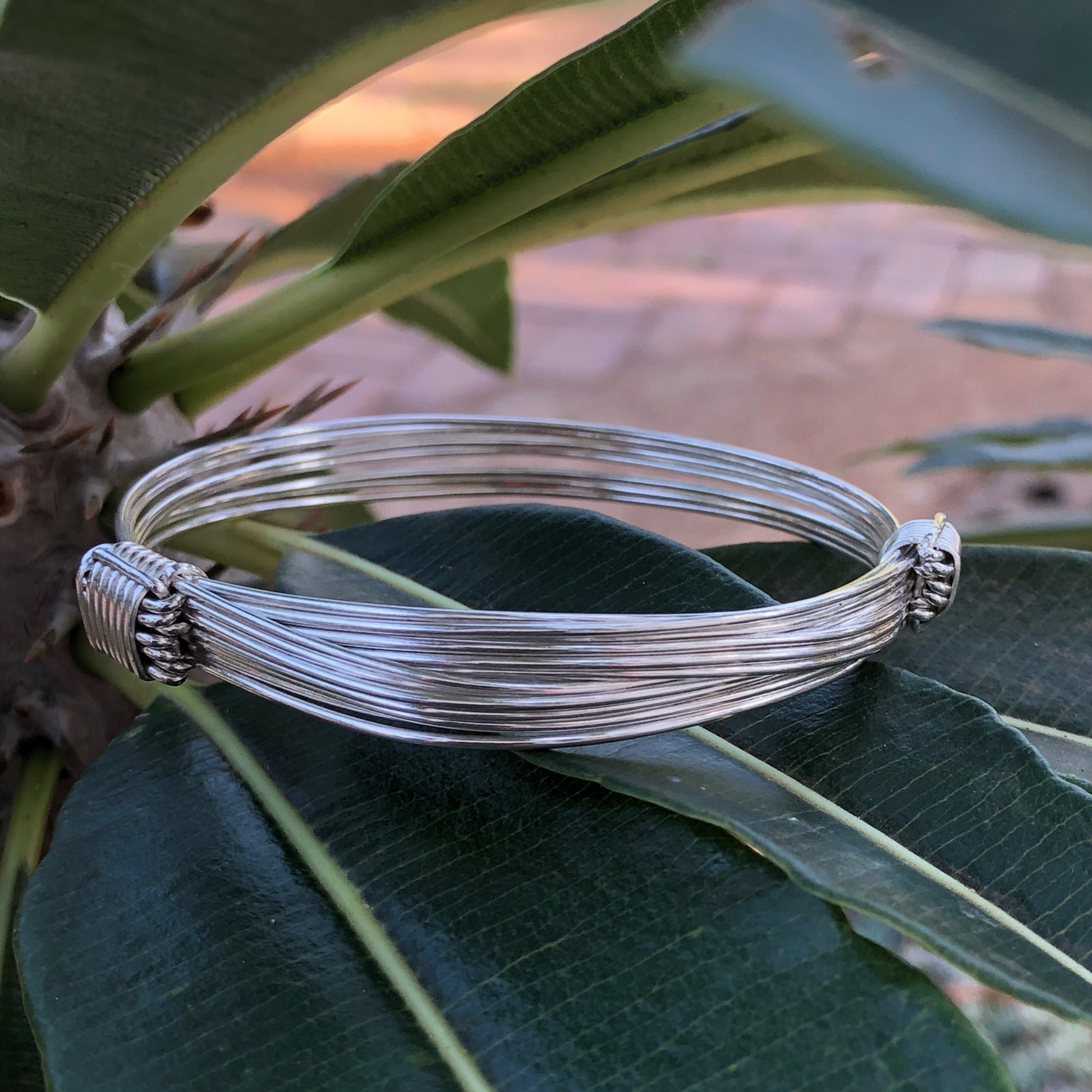 This elegant 7-strand 2knot, sterling silver elephant "hair" bangle is made from 1mm sterling silver wire that has been artfully formed into a bangle that can be opened and closed simply by moving the strands through the knots. This design is based on an ancient African design.